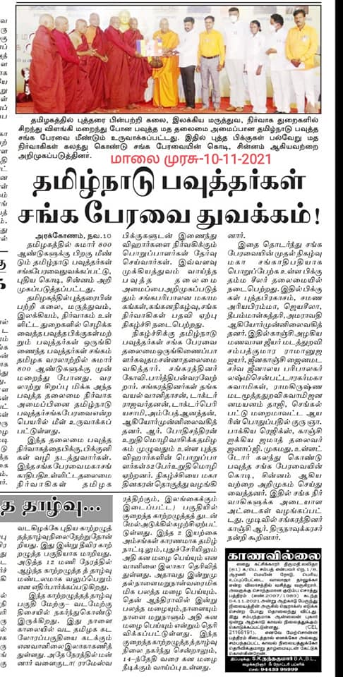 தமிழ்நாடு பௌத்தர்கள் சங்க பேரவை தொடக்க விழா மற்றும் சங்கரத்தினர்கள் அறிமுக விழா23,11,2021 அன்று காஞ்சிபுரத்தில் விழா நடைபெற்றது. இவ்விழாவிற்கான முன்னேற்பாடுகளை மேற்கொள்வதற்கு ஏற்கனவே ஒரு குழு அமைக்கப்பட்டது. நிகழ்வை ஒருங்கிணைக்க தலைமைக் குழு அமைக்கப்பட்டது.