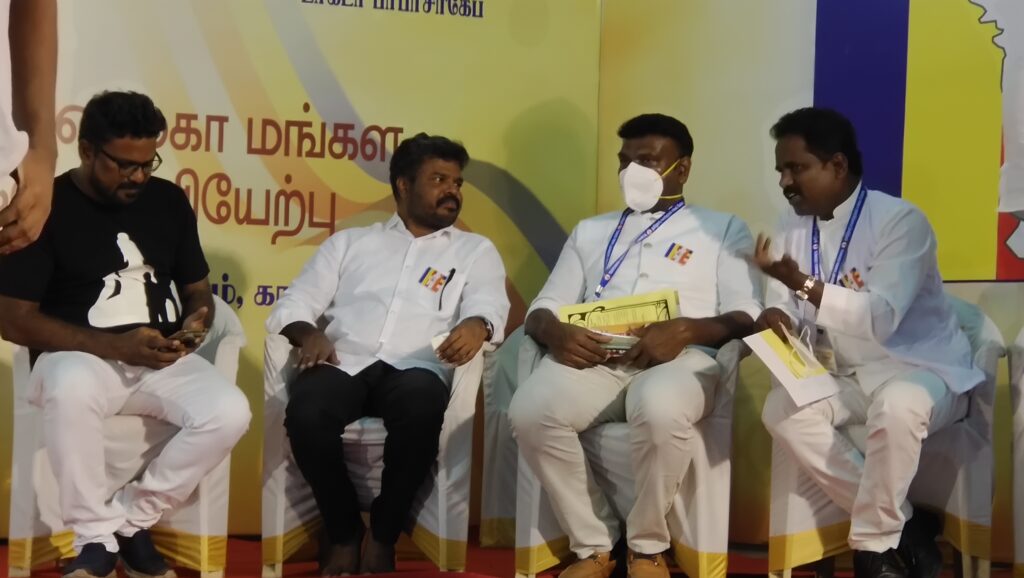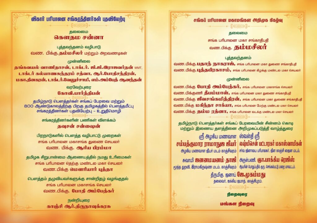 மேற்கண்ட . சங்கரத்தினர்களுக்கு என்று தனி சீருடை தைத்து வரவழைக்கப்பட்டிருந்தது மிக பிரம்மாண்டமான ஏற்பாடுகளுடன் நிகழ்வு தொடங்கியது முதல் கட்டமாக அவைக்கு வந்த சங்கரத்தினர்கள் அனைவருக்கும் சீருடை வழங்கப்பட்டன அவர்கள் சீருடை அணிந்தபடி அரங்கத்திற்குள் வரும் விக்குமார்களை மேளதாளத்துடன் மங்கல கொடையுடனும் வரவேற்று அழைத்து வந்து மேடையில் அவர்களை அமர வைத்தனர் பிறகு வண.பிக்கு தம்மசீலர் அவர்களின் தலைமையில் திரிசரணம் மற்றும் பஞ்சசீலம் ஓதப்பட்டது அதை தொடர்ந்து வரவேற்பு உரையை கோ.பார்த்திபன் அவர்கள் ஆற்றினார். பிறகு ஒவ்வொரு மத தலைவர்களும் வரிசையாக வாழ்த்தி பேசினார்கள் வாழ்த்தி பேசினர்.
