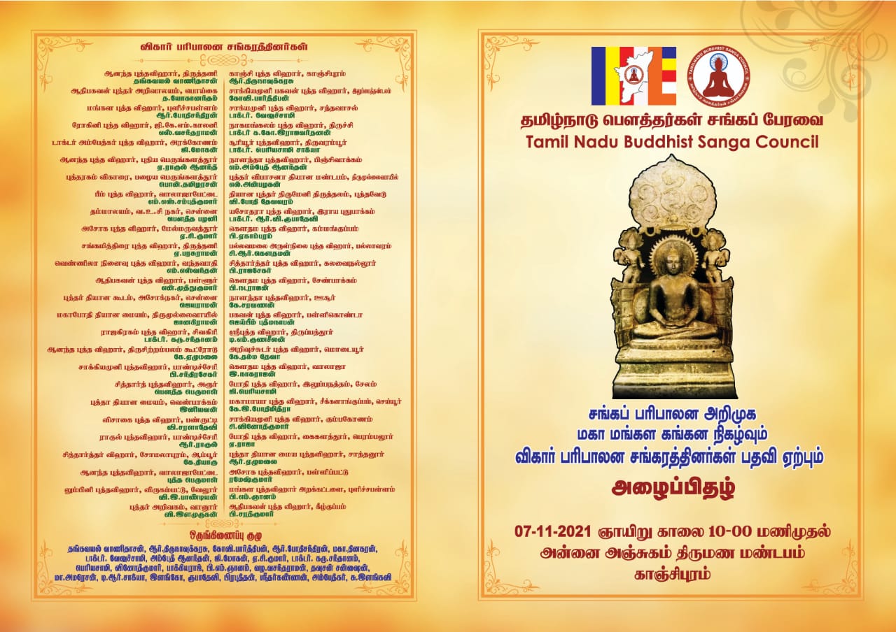 தமிழ்நாடு பௌத்தர்கள் சங்க பேரவை தொடக்க விழா மற்றும் சங்கரத்தினர்கள் அறிமுக விழா23,11,2021 அன்று காஞ்சிபுரத்தில் விழா நடைபெற்றது. இவ்விழாவிற்கான முன்னேற்பாடுகளை மேற்கொள்வதற்கு ஏற்கனவே ஒரு குழு அமைக்கப்பட்டது. நிகழ்வை ஒருங்கிணைக்க தலைமைக் குழு அமைக்கப்பட்டது.